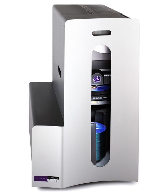 Rimage 7100 System komplett mit Software und wahlweise inklusive Control-Center (Dell-Server) oder als Modell 7100N mit integriertem Steuerrechner.